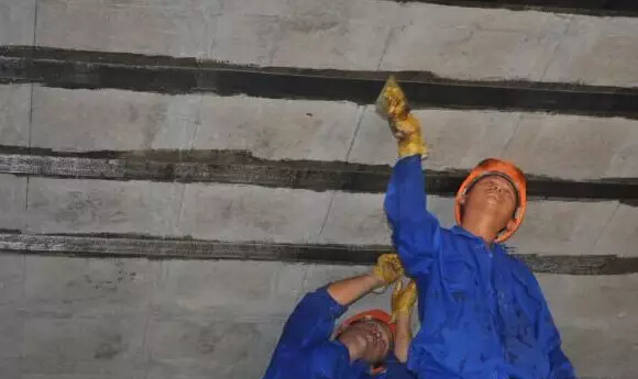 2、按设计要求对破损面钢筋处理后用环氧树脂裂缝胶进行灌缝或封闭处理,并保证钢筋保护层厚度不小于15mm.利用打磨机将其表面打磨平整,并用钢刷将其表面的粉尘、油污等不洁物清除干净,使构件加固表面平整、干燥无粉尘。另外,如碳纤维需沿基纤维方向绕构件转角处粘贴时,转角粘贴处要进行倒角处理并打磨成圆弧状,圆弧半径不应小于20mm.